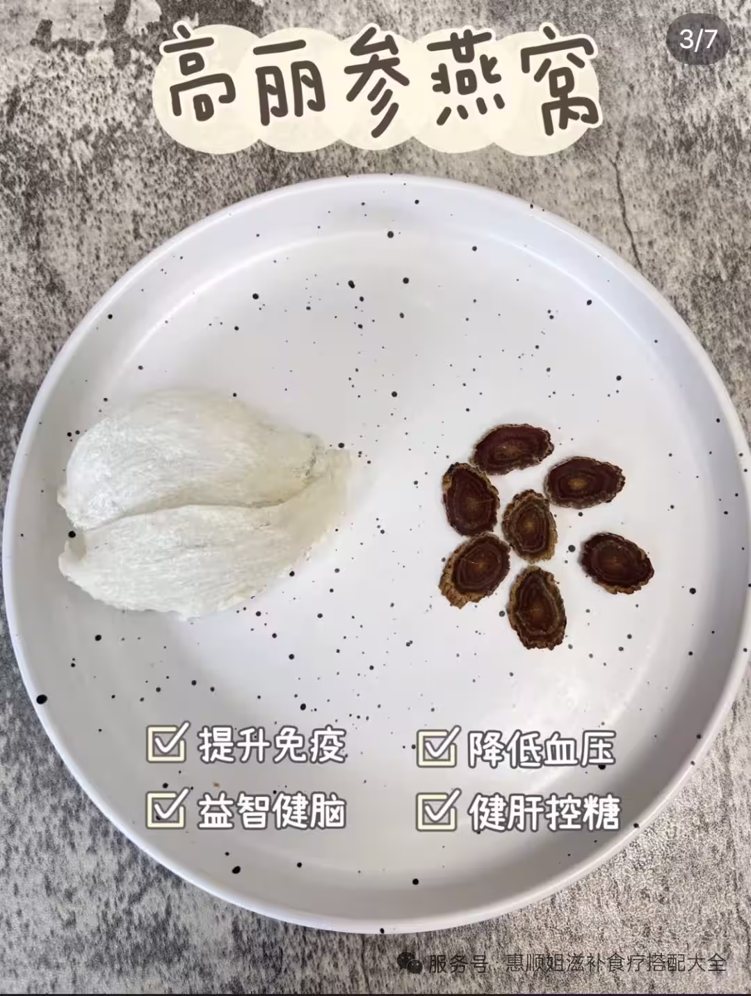 做法:準備泡發好的燕窩,燕窩和適量高麗參一同燉煮 25分鐘即可。