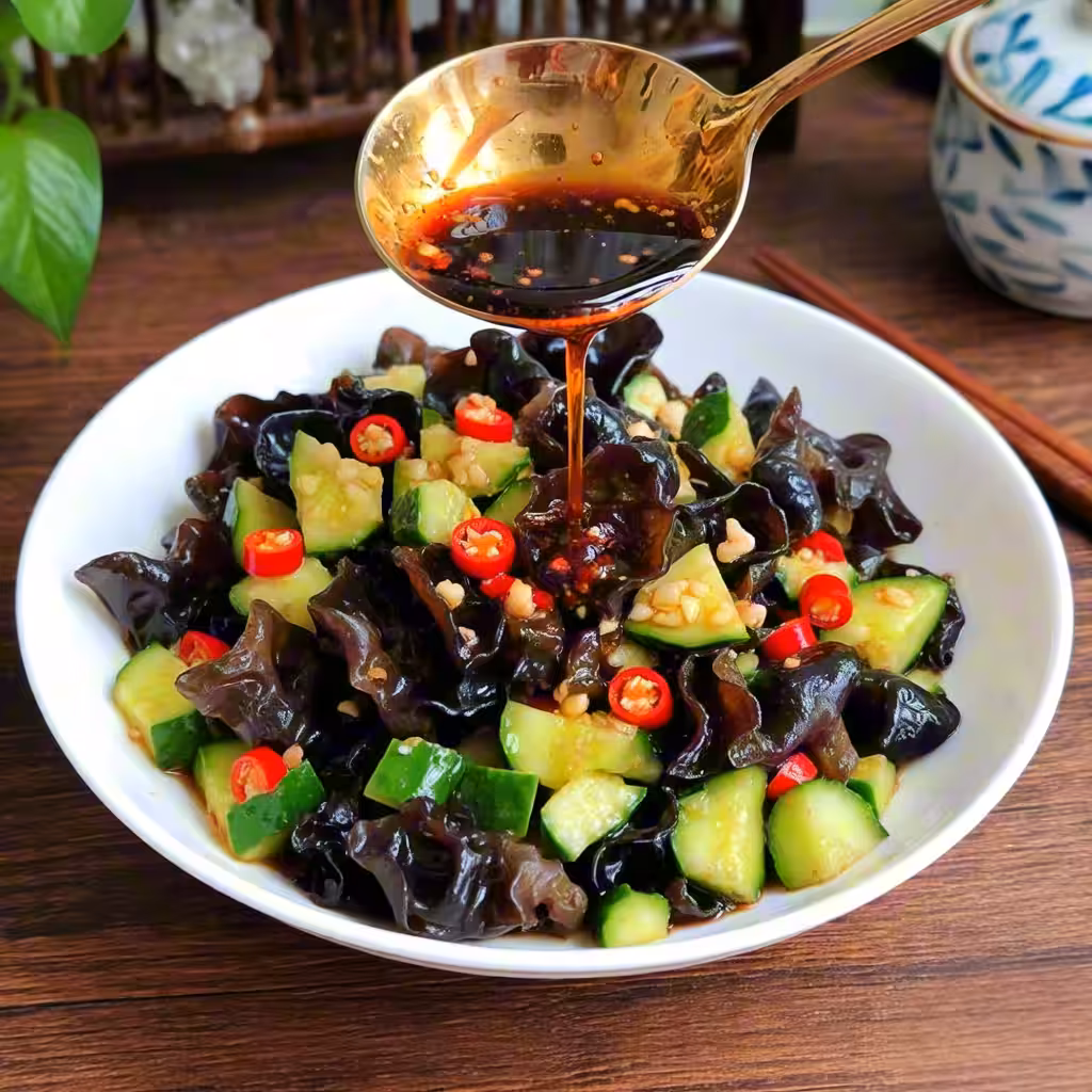 黑木耳30g、黃瓜1根、蒜末、小米辣、生抽、香醋、白糖、香油