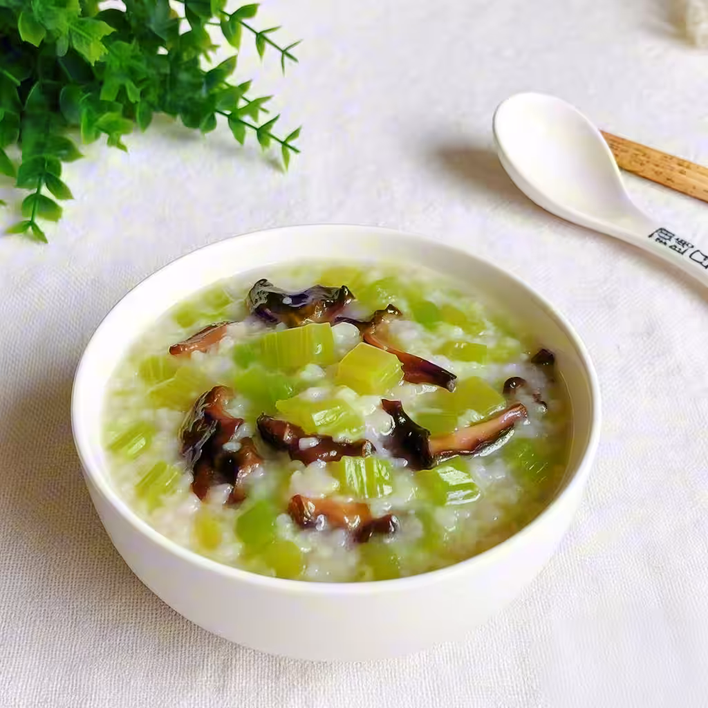 大米80克,芹菜15克,香菇13克,白菜心10克,鹽1.25克,香油3~4滴,水400克。