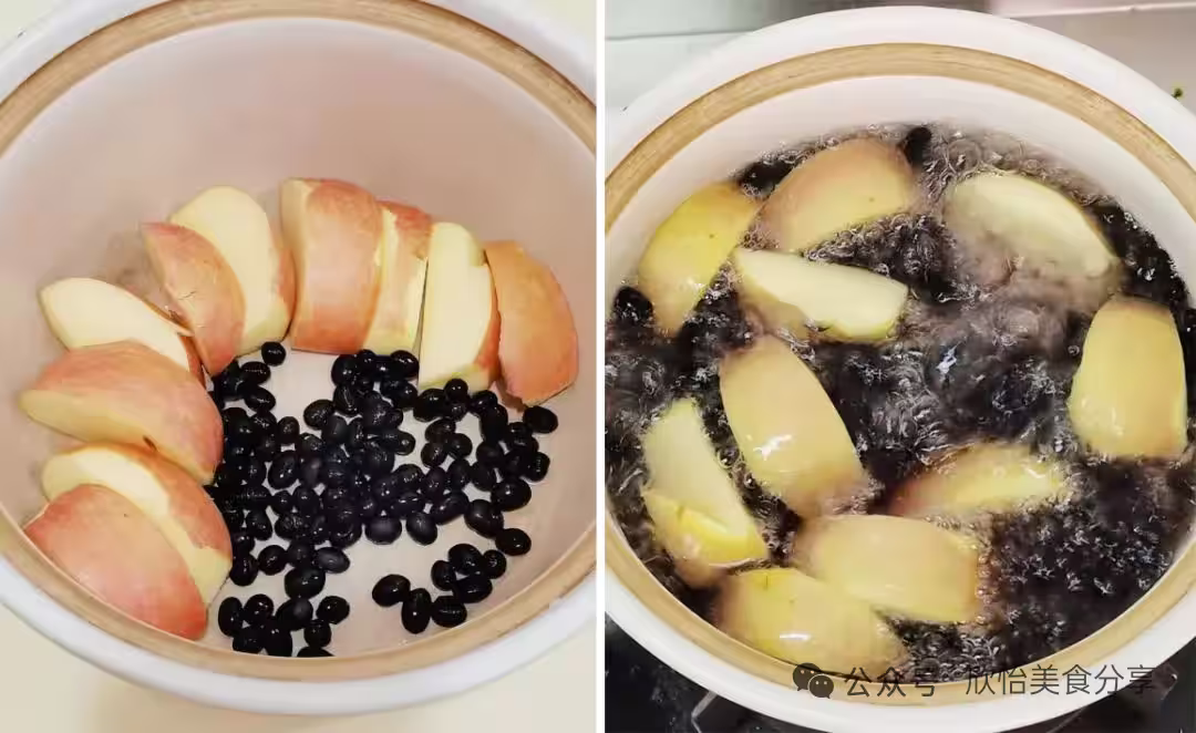 蘋果1個(洗凈連皮切塊,蘋果皮營養超豐富), 黑豆30克(提前浸泡這樣更容易煮爛), 冰糖適量(根據個人口味調整,控糖的可以不加) 做法: 蘋果洗乾淨對半切開,切成小塊,去核;黑豆洗凈(提前浸泡1小時) 鍋中加入適量清水,先把黑豆煮15分鐘左右 加入蘋果,再煮15分鐘關火。