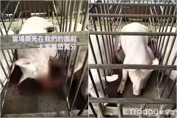 而嘉義義竹鄉一處畜牧場因漏電而導致豬只遭電死,10日養豬協會理事長林志達與畜保科人員到場關心時,突然又再度傳出漏電,現場倖存的豬只只發出一聲慘叫,隨即僵直倒地、七孔爆血而亡,嚇得現場眾人臉色慘白。