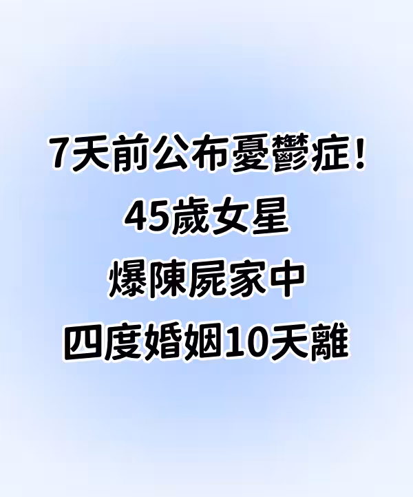 7天前公布憂鬱症!「女星爆陳屍家中」四度婚姻10天離