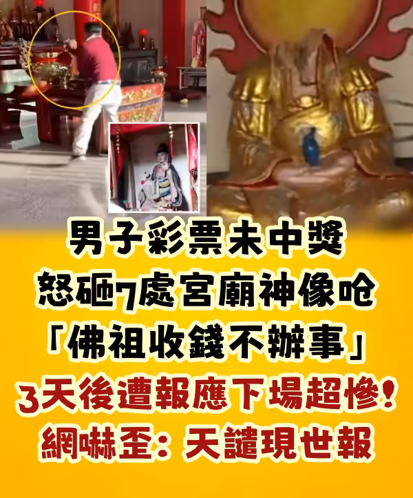 男子彩票未中獎,怒砸7處宮廟神像嗆「佛祖收錢不辦事...」3天後遭報應下場超慘!網嚇歪:天譴現世報