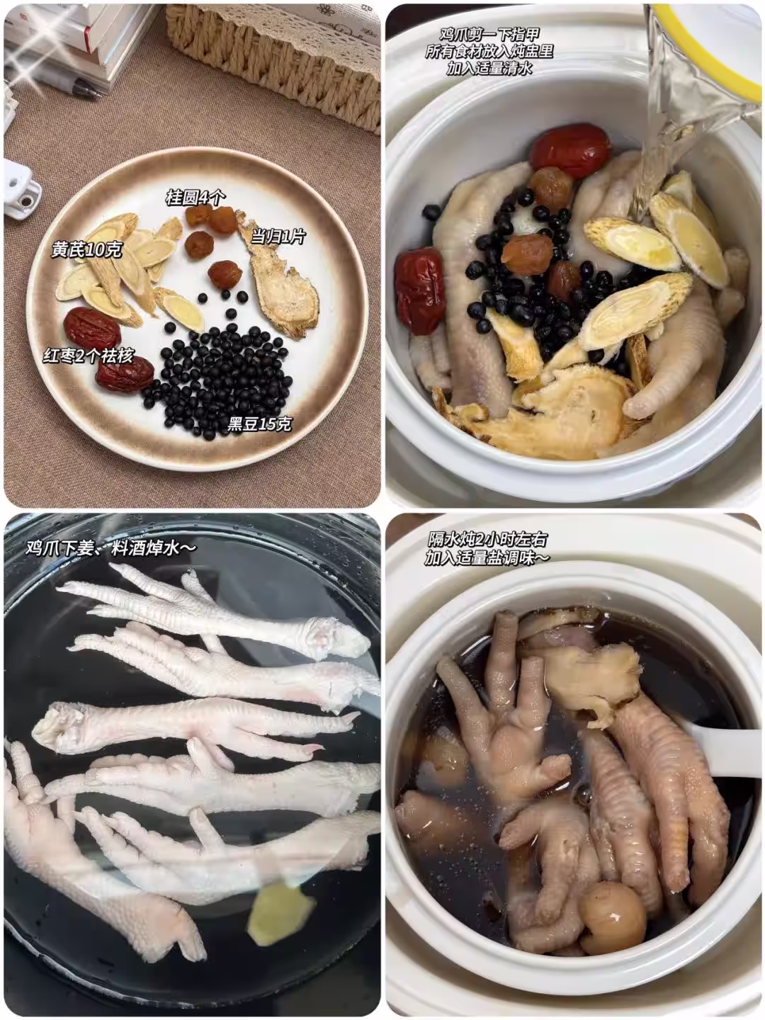當歸1片 ➕ 黃芪10克 ➕ 桂圓4個 ➕ 紅棗2顆 ➕ 黑豆15克 ➕ 雞爪半斤