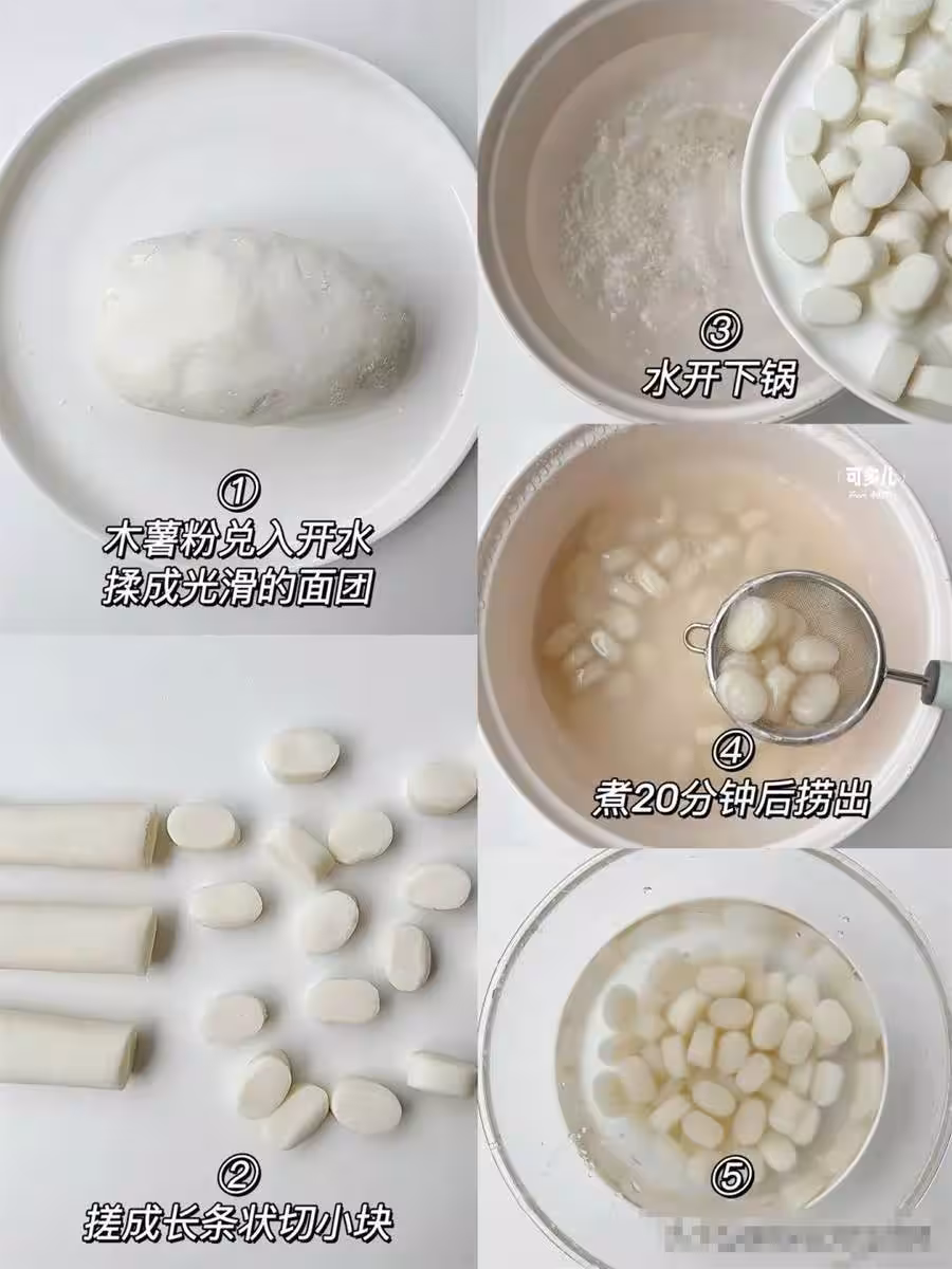 將木薯澱粉兌入開水中,揉成麵糰,搓成長條狀後切成小塊。