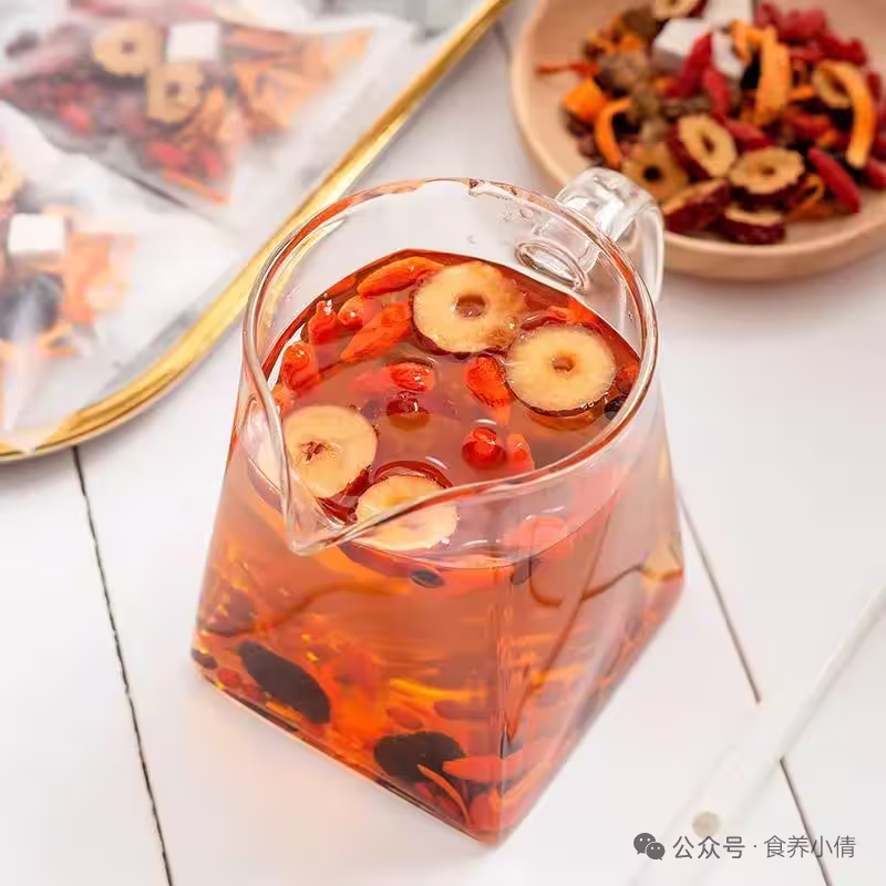 食材有茯苓10克、紅棗5顆、枸杞10克。 做法:紅棗去核切片,所有材料加600毫升水,大火煮沸後轉小火慢煮30分鐘,可以加一小勺冰糖調味。 這個適合晚飯前喝,裡面的紅棗和枸杞帶來自然甜味,茯苓煮軟後易入口,湯水比較溫和滋潤。