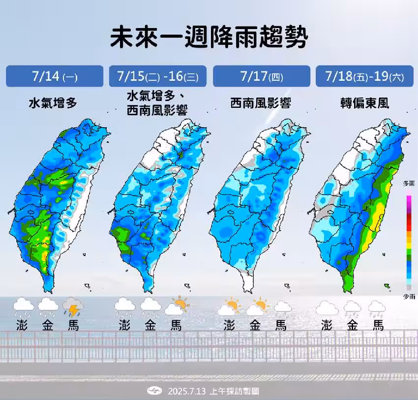 中央氣象署表示,沒下雨時仍較悶熱,各地高溫約32至34度,花東縱谷及彰化地區有局部36度以上高溫。