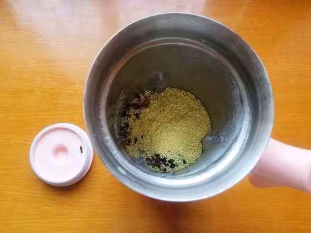 5、將炒好的食材倒入料理機內,稍微晾涼後加入雞精,然後蓋上蓋子,攪打成粉末狀。