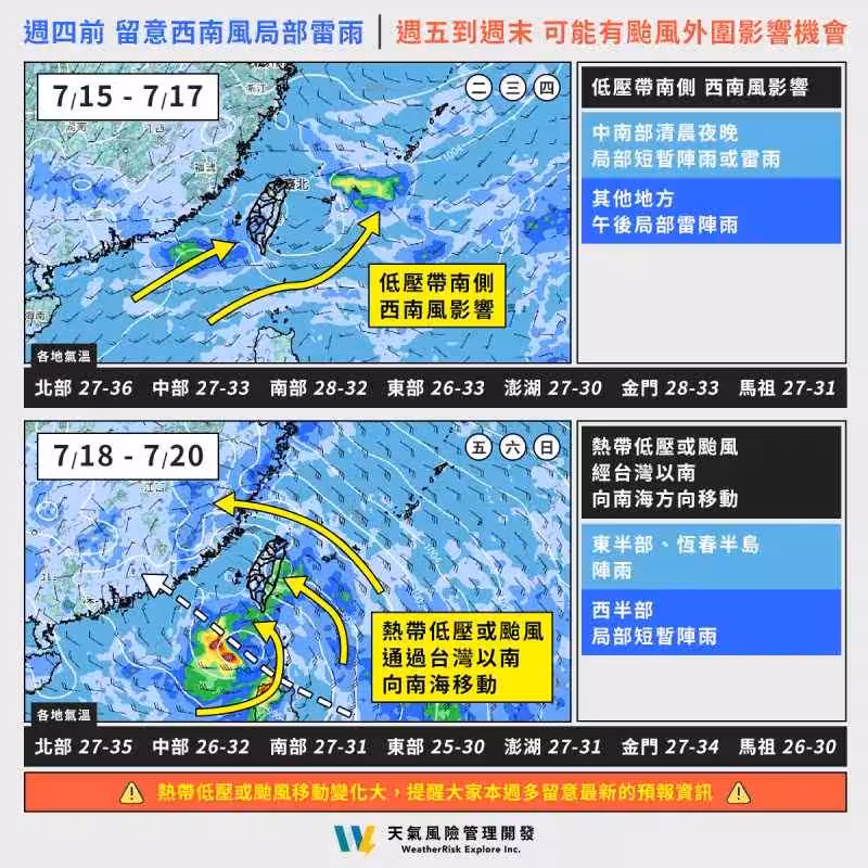 氣象專家林得恩指出,96W最靠近台灣的時間點預計落在周五、周六,迎風面的東部(包含宜蘭、花蓮、台東)、東南部及南部都是96W可能帶來降雨的熱區。美國NCEP數值模式模擬結果顯示,96W不但強度更強、範圍更大,且運動路徑更靠近台灣,對台灣的威脅不容忽視。