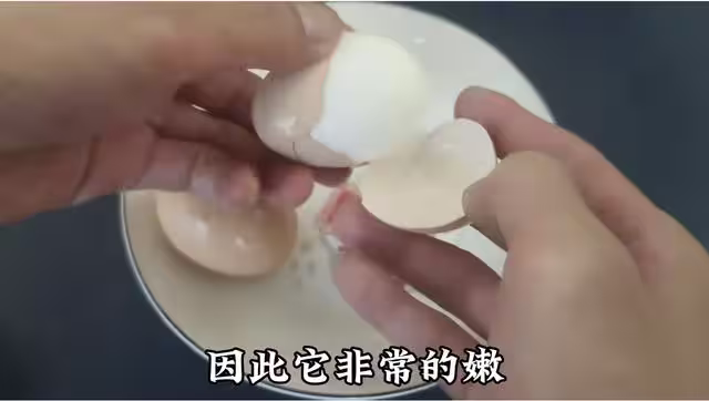 這也是為什麼咱們煮雞蛋的時候,會加上一點白醋的原因,可以看見,就算是加了白醋,剝雞蛋殼,也並不是像熟透的雞蛋那麼好剝,直到將雞蛋殼全部剝掉,剝好雞蛋殼以後,先放在一旁備用!