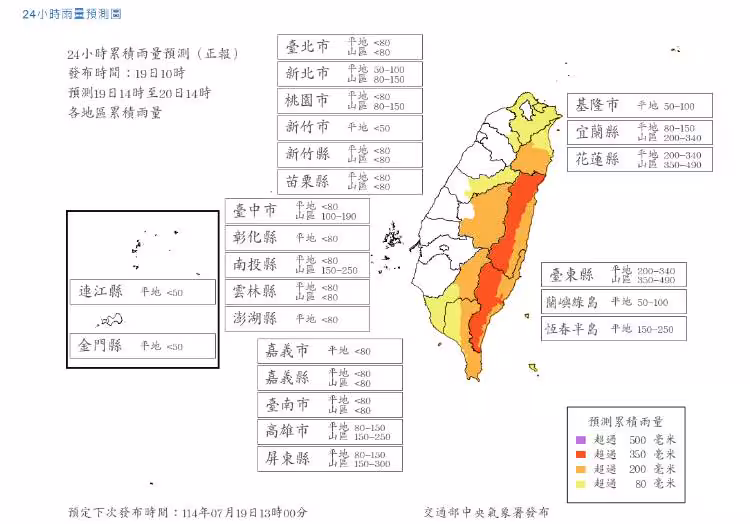 依行政院「天然災害停止上班及上課作業辦法」規定,預測颱風暴風半徑於4小時內可能經過之地區,其平均風力可達7級以上或陣風可達10級以上時,或未來24小時累積雨量預測達山區200毫米及平地350毫米(部分縣市略有不同),且已致災或有致災之虞時,達到停班停課標準 。但還是要由當地的縣市政府自行決定是否停班停課。