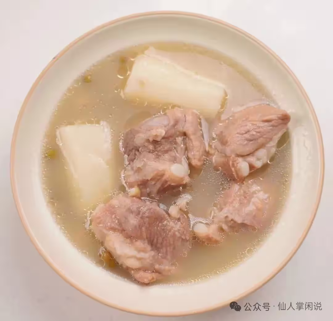 燉湯: 砂鍋里放排骨、蓮子、薑片,加足量清水,大火煮開後轉小火燉 1 小時,放入山藥再燉 30 分鐘。