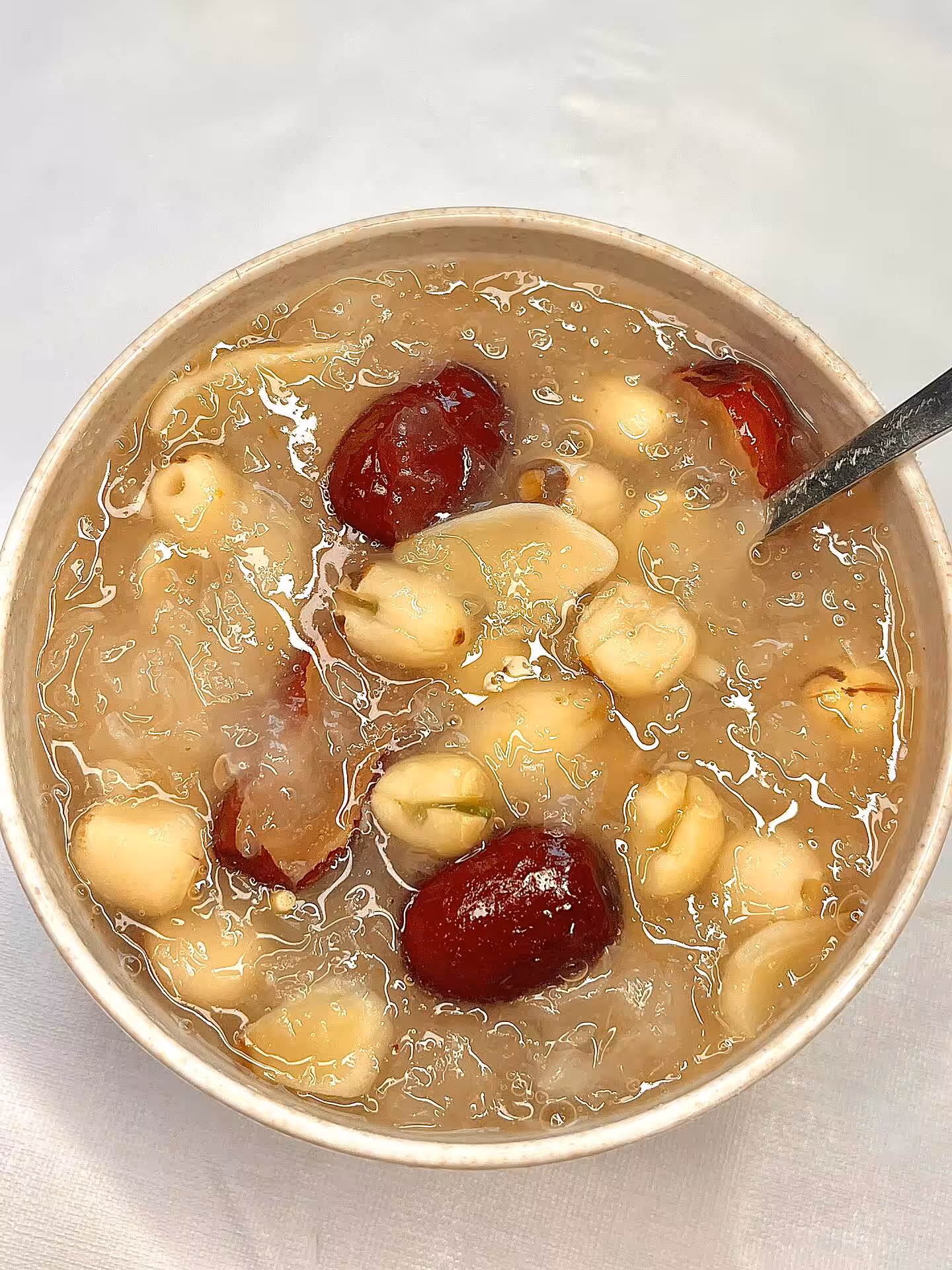 有沒有過年跟我一樣吃零食吃到喉嚨干啞!鼻子起泡的姐妹👭!上火太難受了!這個蓮子百合羹就是及時雨清熱降火效果特別好!我每次都喝2-3碗~潤潤的!銀耳燉出膠和蓮子百合糯糯的!秋冬季節來一碗暖暖的!健脾養胃!!建議女孩子多喝!養顏低卡皮膚白皙透嫩!!