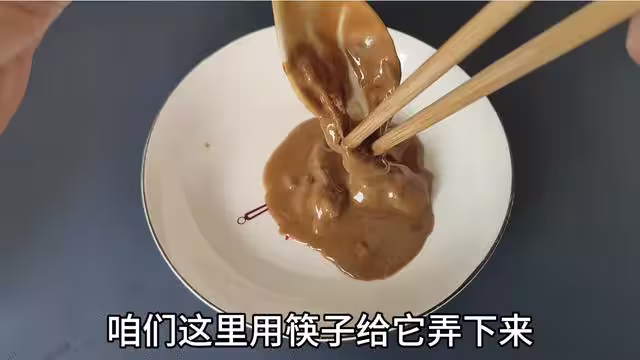 並且沒有經過調製的芝麻醬,其實它的香味並沒有那麼濃郁,因為芝麻醬裡面的香味要經過特殊的調製,才能激發出它裡面的味道,這裡不需要太多,我們調製2到3勺即可,而粘在勺子上面的芝麻醬,咱們這裡用筷子給它弄下來,現在的芝麻醬感覺起來特別的粘,看起來也特別的丑。