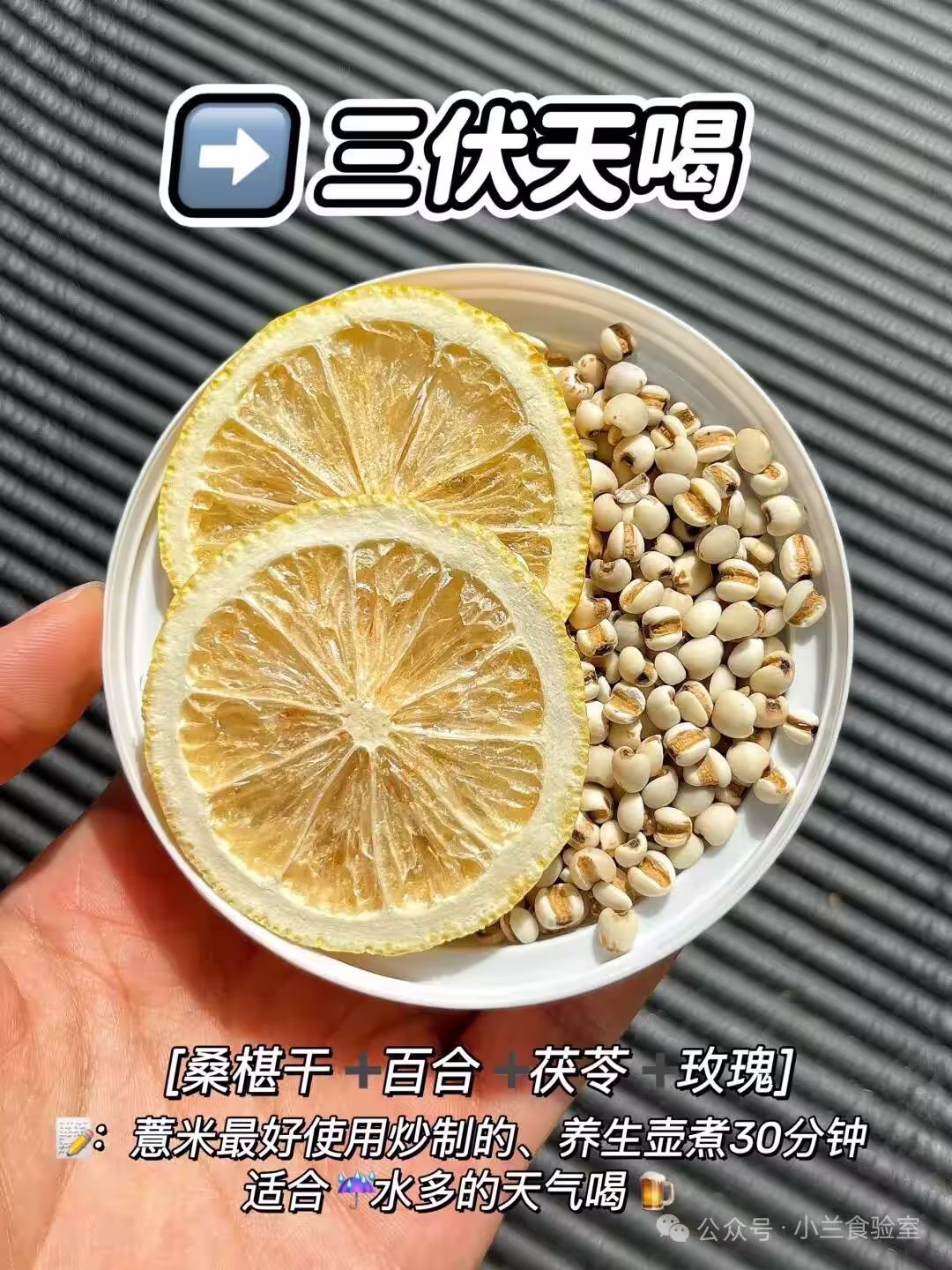✅ 薏米+500ml水→大火煮沸→轉小火煮20分鐘→關火前3分鐘加檸檬片