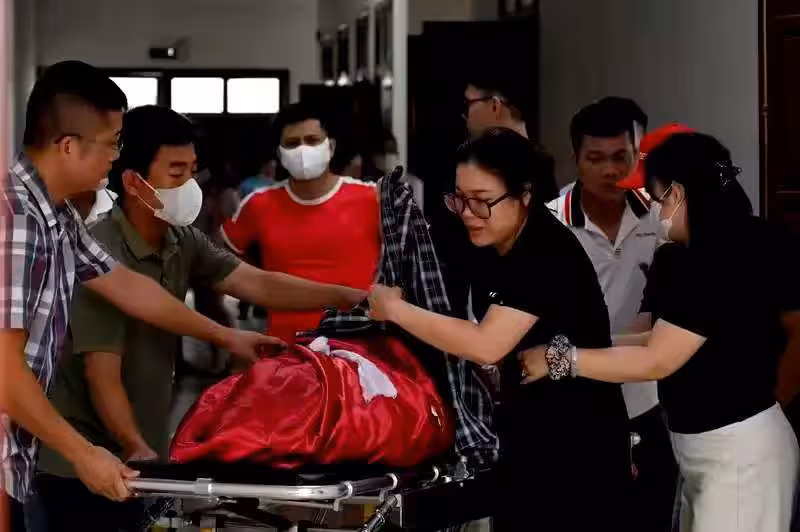 在下龍市主要的殯儀館內,多具以紅布包裹的遺體被用擔架抬入館內,親友們在10多個棺材之前悲泣不已。