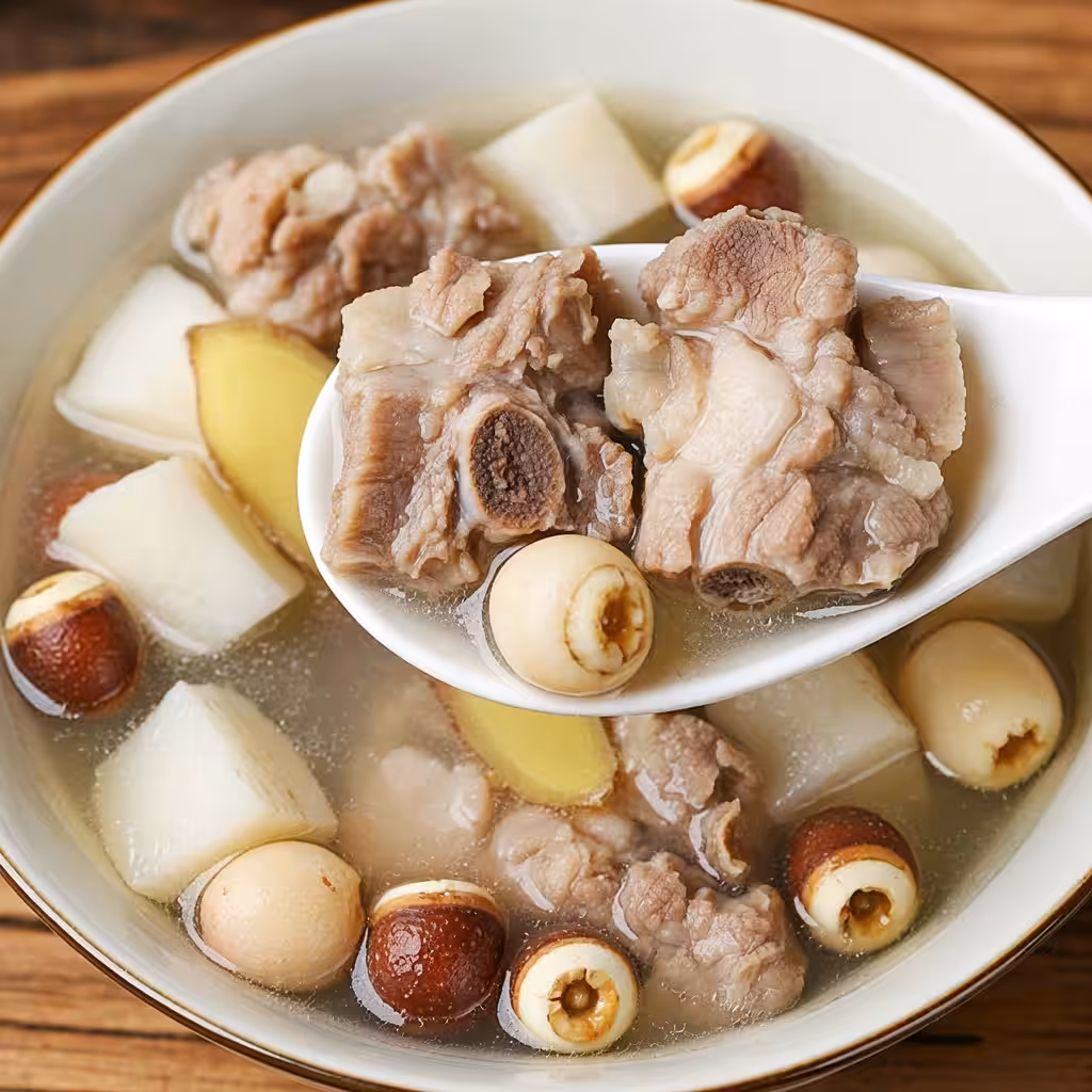 【功效】源自中醫經典「四神湯」,茯苓利水滲濕、芡實益腎固精、山藥健脾補肺、蓮子清心安神,搭配排骨補中益氣,是夏季祛濕健脾的黃金組合。