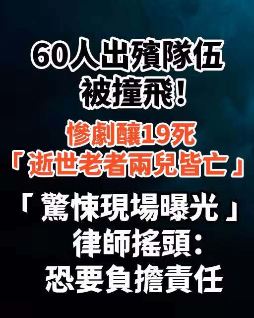 60人出殯隊伍被撞飛!慘劇釀19死「 逝世老者兩兒皆亡 」「 驚悚現場曝光 」律師搖頭:恐要負擔責任