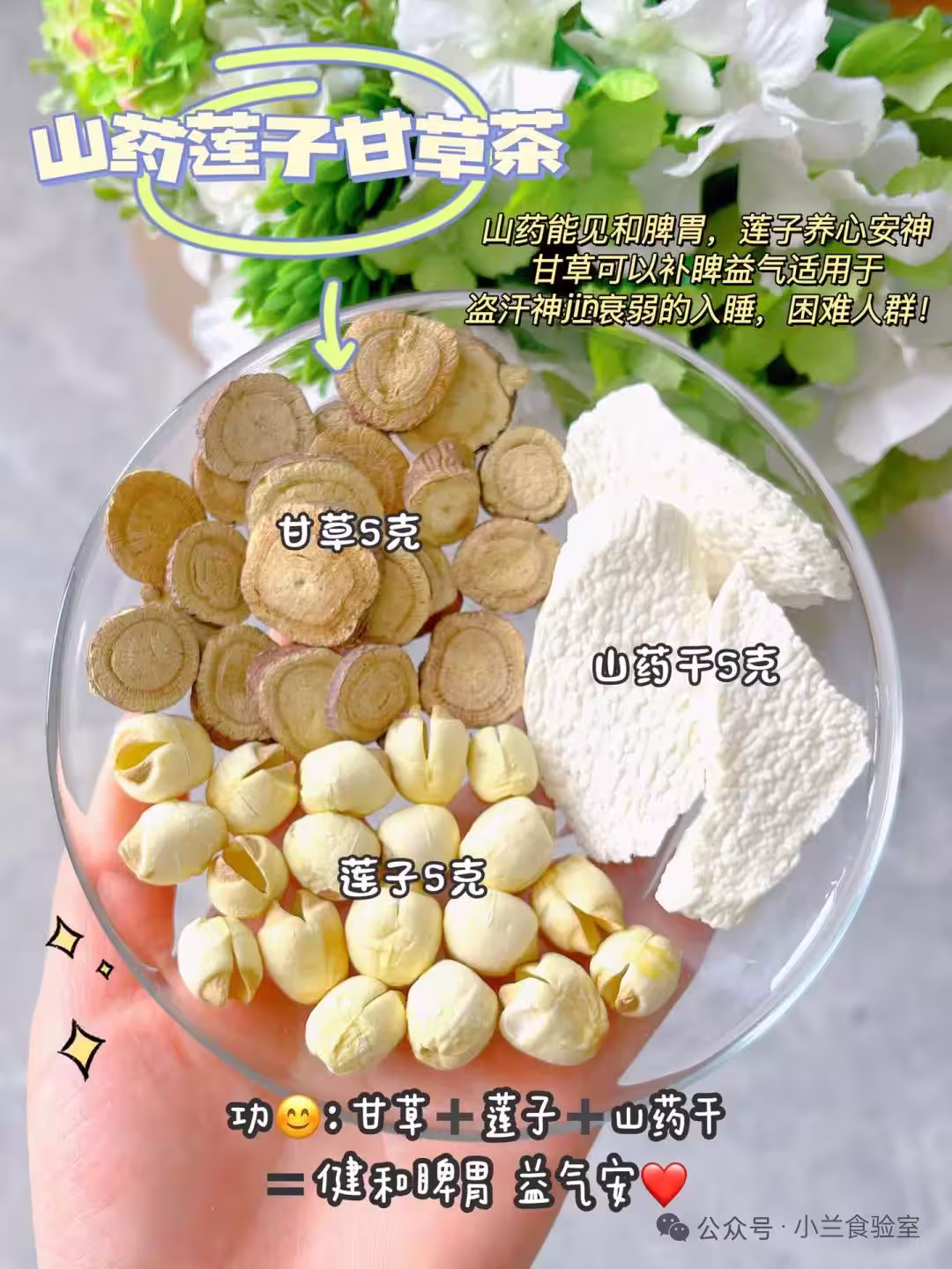 1. 準備食材:稱量甘草5克、山藥干5克、蓮子5克。蓮子可稍浸泡軟化(提前10分鐘)。