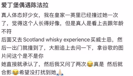 而如今沒有合約束縛的陳法拉則可以全世界各遊玩了,最近就有在英國的網友在愛丁堡偶遇陳法拉,而網友更是稱讚陳法拉的體態好少女,當天他偶遇了兩次,但該網友只是覺得有點像,以為不是真的陳法拉,沒想到後來再次遇到陳法拉,他也大膽的追上去問了一下,而陳法拉也很大方的承認了,併合了影。
