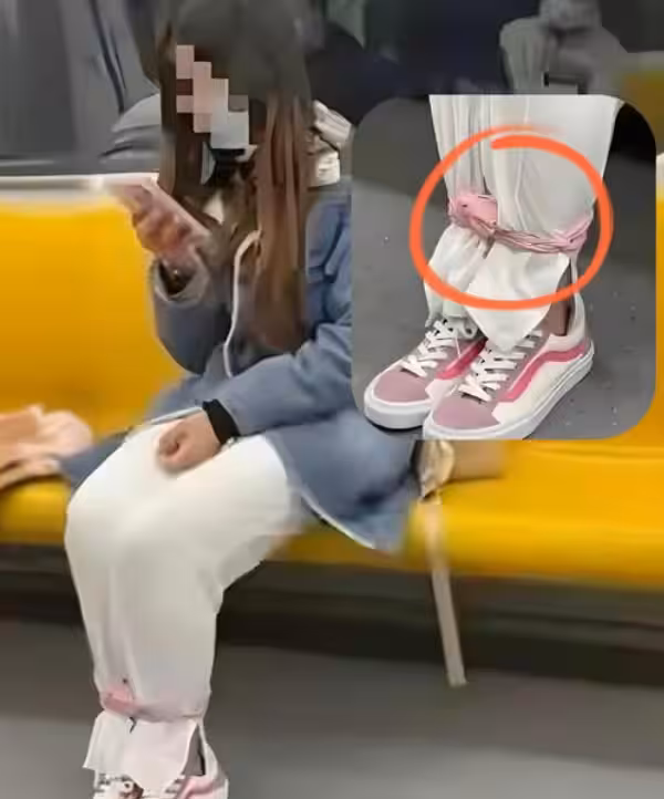 她安靜地坐在座位上,雙腿被一根粉色尼龍繩緊緊捆綁,繩子深深勒進皮肉,卻依然若無其事地刷著手機。