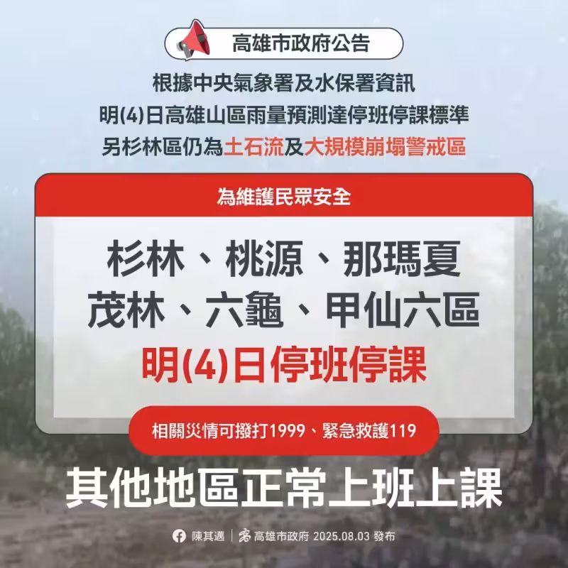 根據氣象署的24小時累積雨量預測,嘉義縣山區150至250毫米、高雄市山區200至300毫米、屏東縣山區200至300毫米,皆達到停止上班上課標準。