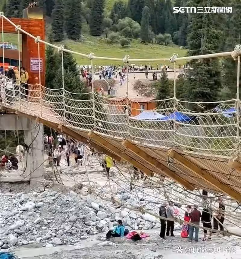 新疆網紅吊橋斷裂意外發生後,許多遊客也拍下當時的狀況,現場陷入恐慌混亂的氛圍中。(圖/翻攝微博)