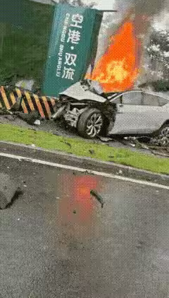 這是網友拍攝的現場圖,據目擊者講述,當時這輛汽車速度非常快,但不是正常行駛在道路上,而是飛速衝撞到馬路一側,看起來大概是方向失控,在發出碰撞的聲音後,就出現了爆燃現象。