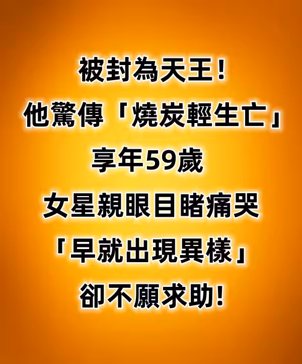 被封為天王!他驚傳「燒炭輕生亡」享年59歲 女星親眼目睹痛哭「早就出現異樣...」:卻不願求助!
