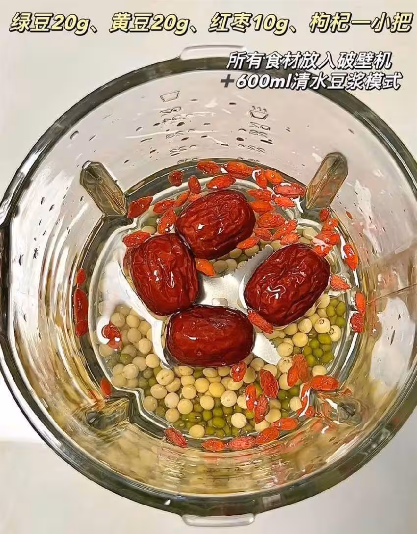 將浸泡好的黃豆、綠豆、紅棗和枸杞放入破壁機中,加入適量清水,選擇豆漿模式打制至細膩。