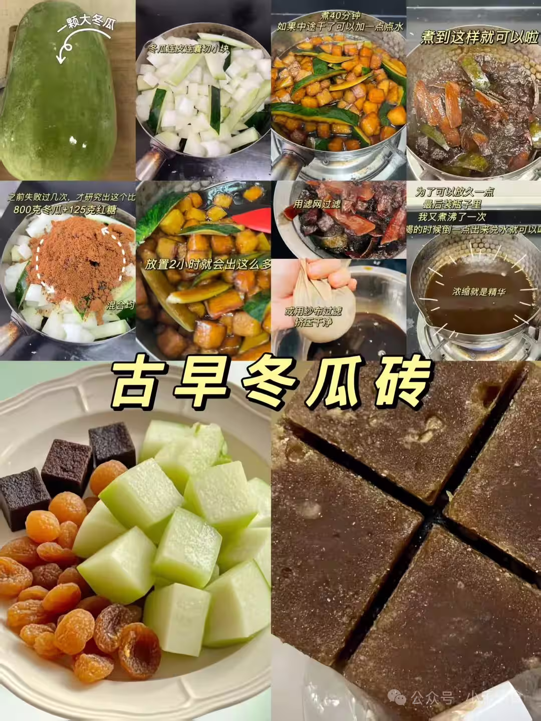 冬瓜切小塊,和紅糖混合均勻,靜置出汁;小火慢煮至濃稠,過濾出汁,再煮沸一次做成濃縮冬瓜磚,要喝的時候,掰一塊,加開水沖泡,方便又好喝!