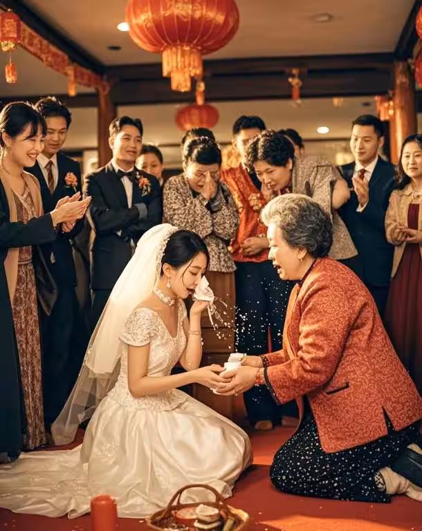 新娘敬茶時被婆婆潑卸妝水,她當眾擦掉半張臉,全場親戚突然集體下跪!