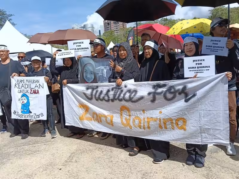 據了解,今早分別在沙巴蘭瑙和納閩直轄區也展開聲援集會,緊接著下午4時,位於斗亞蘭及班台馬尼士(Pantai Manis)也有群眾加入集會行列,許多男女老少身穿黑衣,都拿起「#Justice4Zara」的大字報和布條,高喊聲援口號。「13歲少女宗教學校宿舍墜樓」案;隨著總檢察署發出指令,警方於今午5時許拉隊到墳墓挖出死者遺體,重新驗屍。