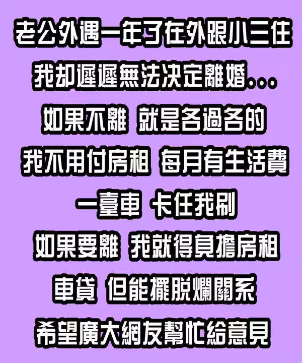 老公外遇一年了,在外面跟小三住,我卻遲遲無法決定離婚... 如果不離,就是各過各的,我不用付房租,每月有生活費、一台車、卡任我刷;如果要離,我就得負擔房租、車貸,但能擺脫爛關係,希望廣大網友幫忙給意見