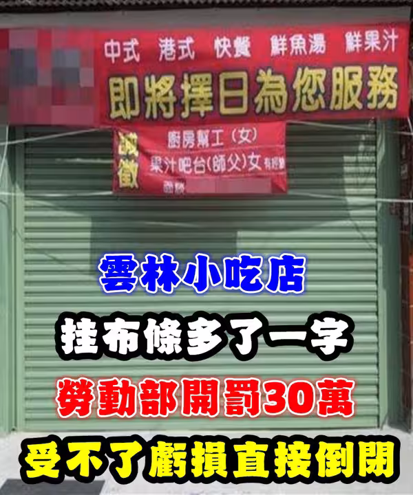 雲林小吃店還沒開業「掛布條徵人多一字」勞動部「開罰30萬」受不了虧損直接倒閉