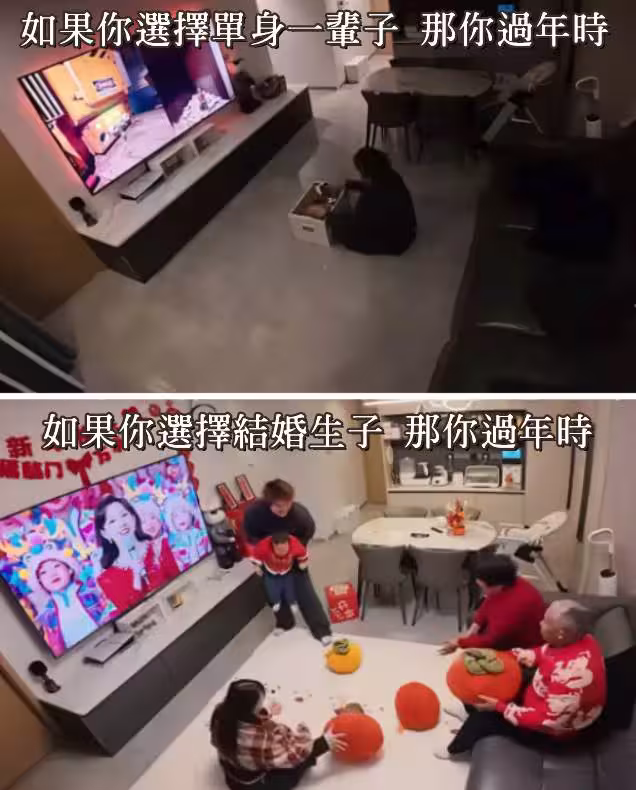第一張圖片展示了一個單身人士在過年時的情景。畫面中,一個人獨自坐在電視機前,周圍是冷清的房間,顯得有些孤獨。這種情景可能會讓人產生一種衝動,想要結束單身生活,尋找一個伴侶共同度過節日。