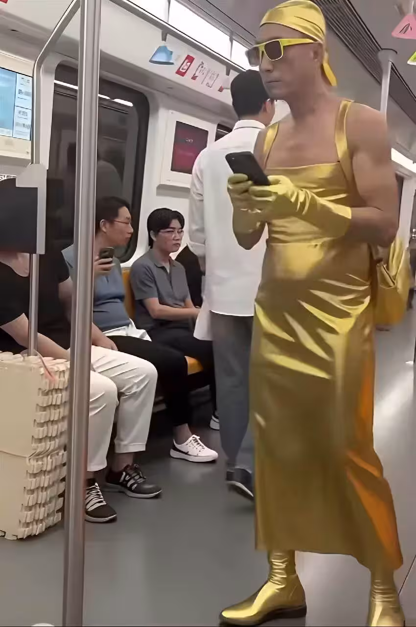 捷運上巧遇一位「金色弔帶裙大叔」超搶眼!捷運變秀場,不料仔細看去「眾人笑不出來了」