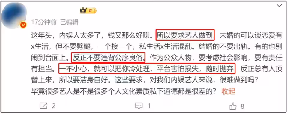 此前還有網友稱許凱下一部劇是芒果的,肯定會被力保。但大V也放出口風,劇還沒開拍,平台隨時可以換人,「即使是於正」。看來哪怕有於正這個老闆撐腰,許凱也面臨掉資源的風險。