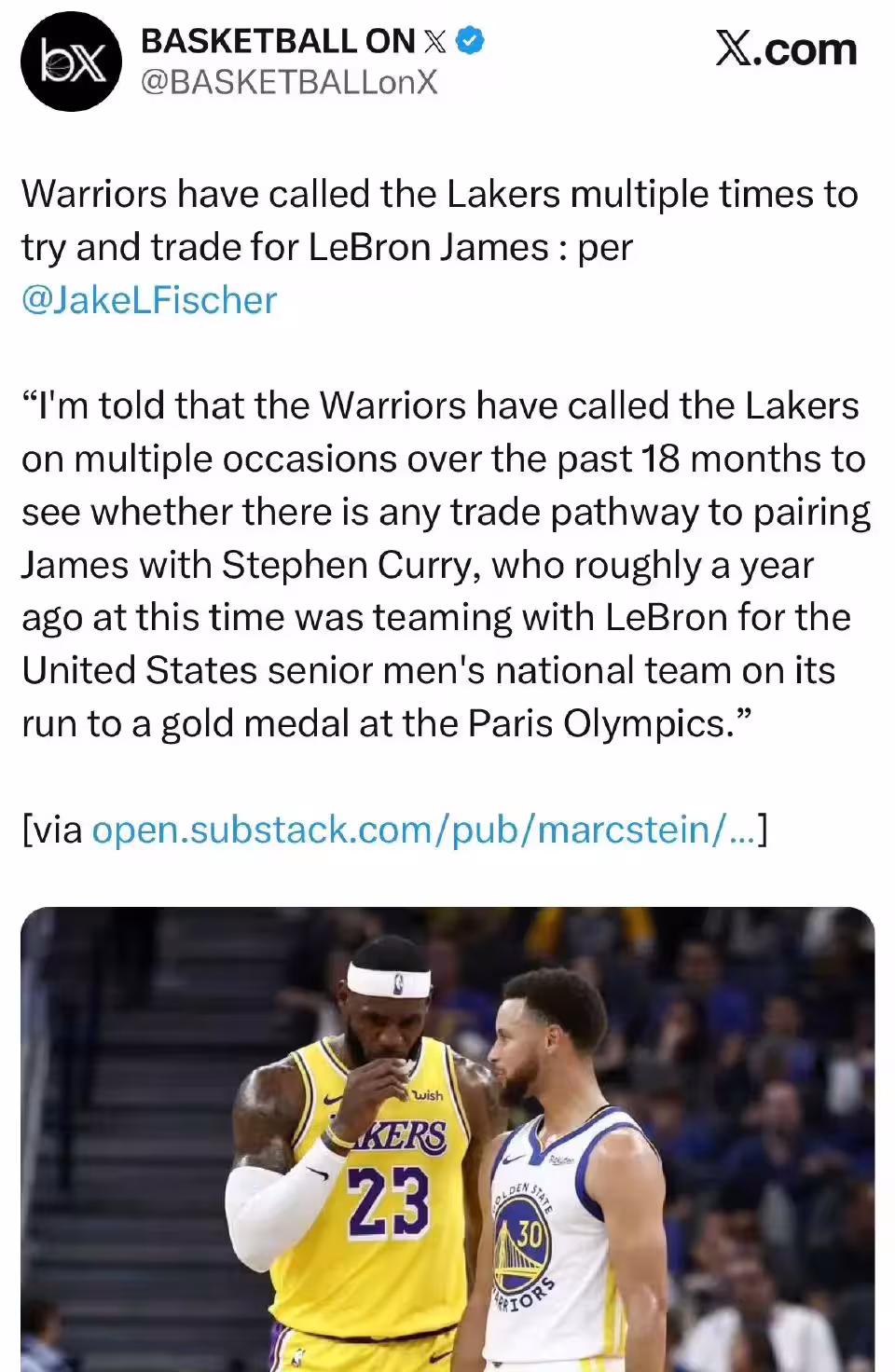 時間回到2024年2月,在當時NBA交易截止日前一天,勇士便展現出強烈的求賢欲。球隊老闆拉科布親自致電湖人老闆珍妮巴斯,詢問交易詹姆斯的可能性。不過,湖人當時明確拒絕交易,詹姆斯本人也表態願留湖人,勇士首次追逐以失敗告終。