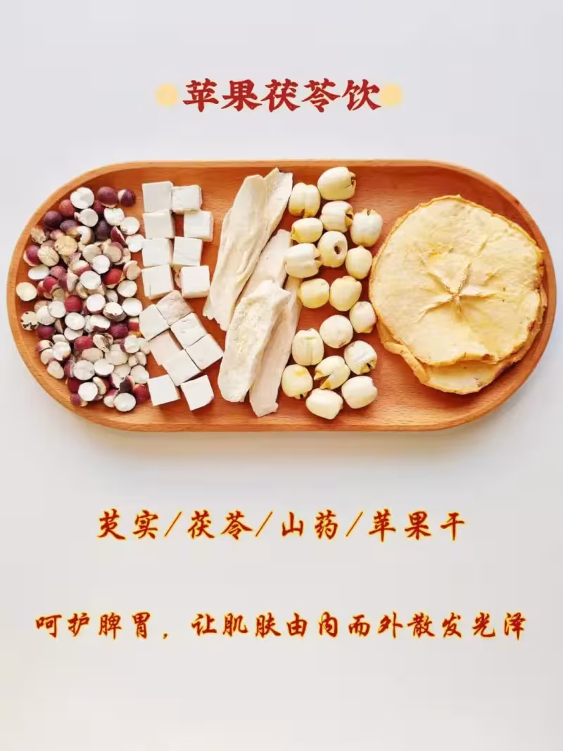 1、準備蘋果、山藥、蓮子、茯苓、芡實等食材。
