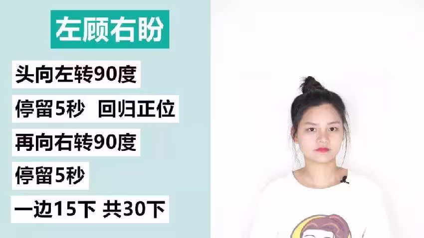 頭向左轉90度,停留5秒回歸正位,再向右轉90度,停留5秒回歸正位,一邊15下共30下