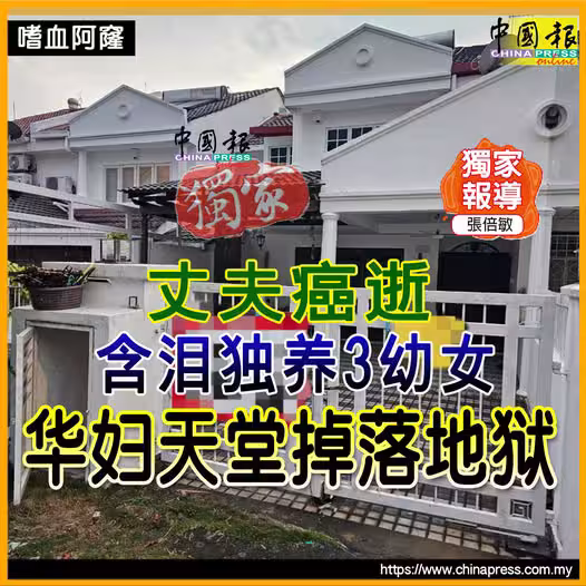 (吉隆坡26日訊/獨家報導)丈夫患癌後,被迫賣房籌醫藥費,華裔婦女也結束洗衣店生意,前後花了40萬令吉醫治,但丈夫仍不敵死神召喚,她含淚獨養3幼女,直言生活猶如從天堂掉到地獄!