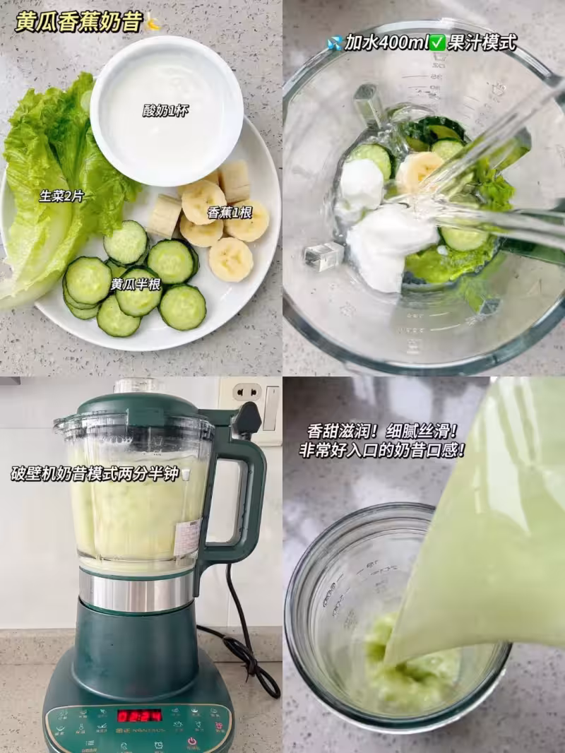 半根黃瓜、一根香蕉、兩片生菜、一小杯酸奶,還需要準備大約400毫升的清水。
