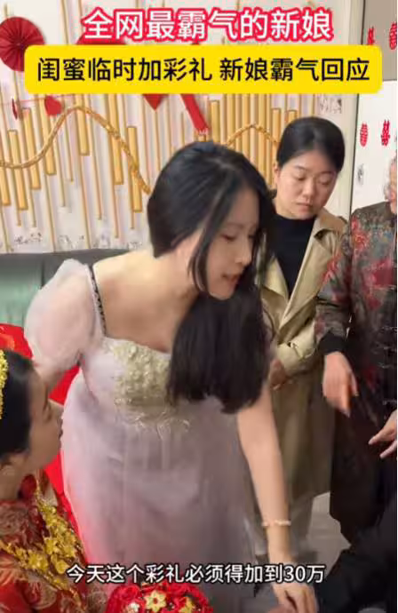 影片里,新娘穿著白紗坐在化妝桌前,妝也畫得美美的,準備迎接人生最重要的時刻。結果多年好友突然出招,等接親的人一到,馬上開口說要追加三十萬的彩禮,還講得很直白:「現在不開口,婚後更沒機會!」