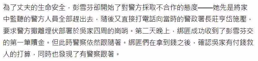 面對綁匪稱再發現警察便撕票的威脅,彭雪芬便採取對警方不合作的態度。