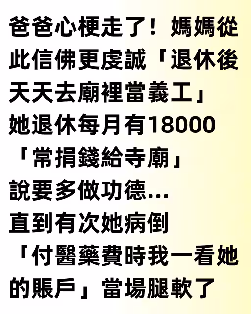 爸爸心梗走了!媽媽從此信佛更虔誠「退休後天天去廟裡當義工」,她退休每月有18000「常捐錢給寺廟」說要多做功德… 直到有次她病倒「付醫藥費時我一看她的帳戶」 當場腿軟了