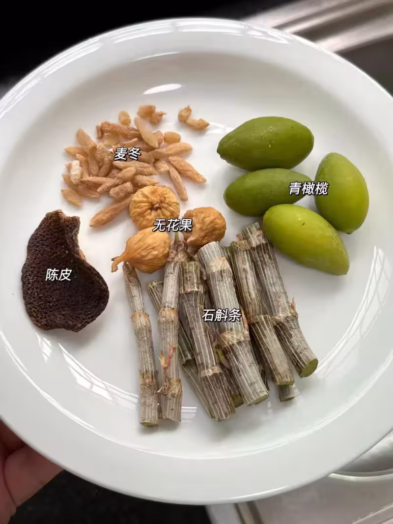 青橄欖3 - 4個、石斛5g、麥冬5g、陳皮半瓣、無花果2 - 3個、瘦肉適量