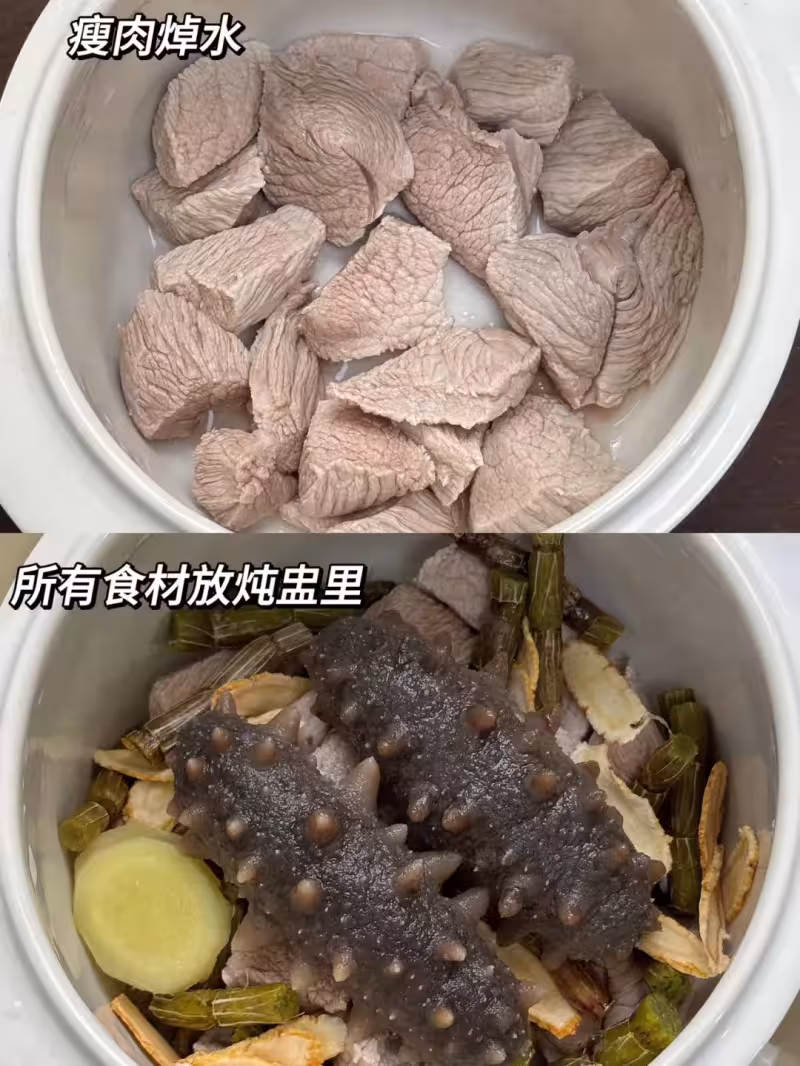 海參2頭、西洋參3克、鮮石斛20克、姜2片,瘦肉適量