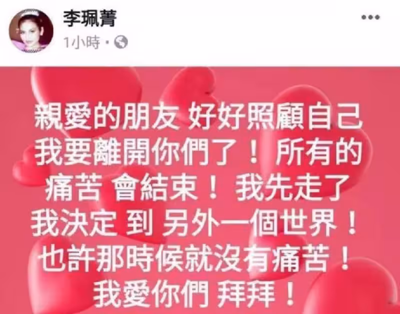 而在吞藥之前,李佩菁還透過社交網絡留書,向世界告別,李佩菁在PO文中寫道:「親愛的朋友,好好照顧自己,我要離開你們了!