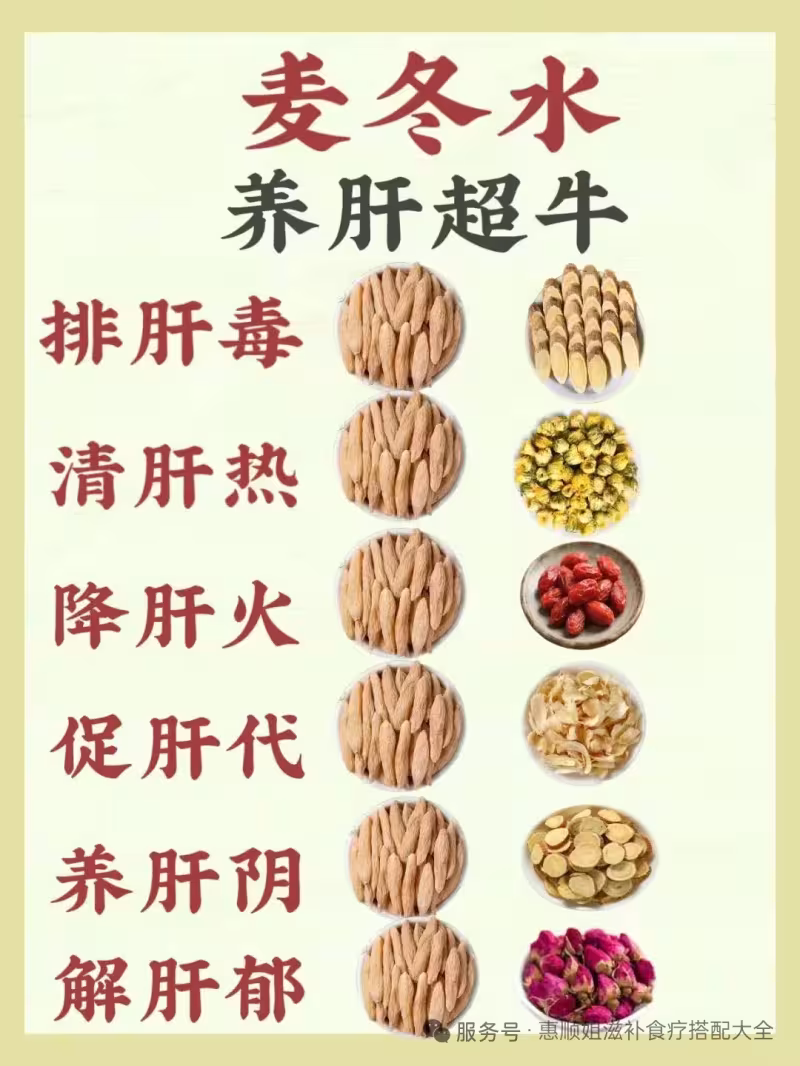 寶子們,肝臟可是咱們身體的「解毒工廠」啊!但現代生活節奏快,熬夜、應酬、壓力山大,你的肝是不是也快「過勞肥」了? 別擔心!今天給大家分享一個養肝護肝的寶藏好物——麥冬水! 麥冬性微寒、味甘,用它泡水喝,能: 滋陰潤燥:給身體補補水,對抗乾燥。 潤肺止咳:嗓子不舒服也能幫上忙。 滋養肝陰:對咱們的肝臟特別友好! 尤其適合: 應酬多、常喝酒的你 熬夜加班、作息不規律的你 容易上火、口乾舌燥的你 簡直堪稱「肝臟救星」有沒有? 光喝麥冬水不夠過癮?別急!今天就送上6款麥冬煮水的神仙搭配
